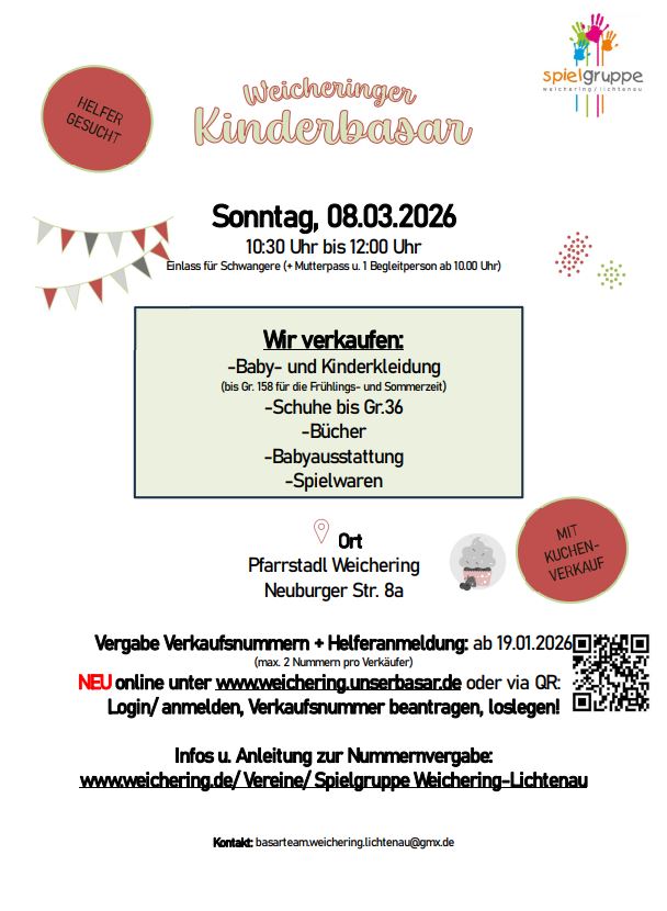 Für den Verkauf beim diesjährigen Frühjahrsbasar am 08.03.2026 erfolgt die Nummernvergabe ab 19.01.2026 über www.weichering.unserbasar.de. Eine Schritt-für-Schritt-Anleitung zum Erstellen eines Kontos und zum Erfassen der Verkaufsdaten finden Sie weiter unten.