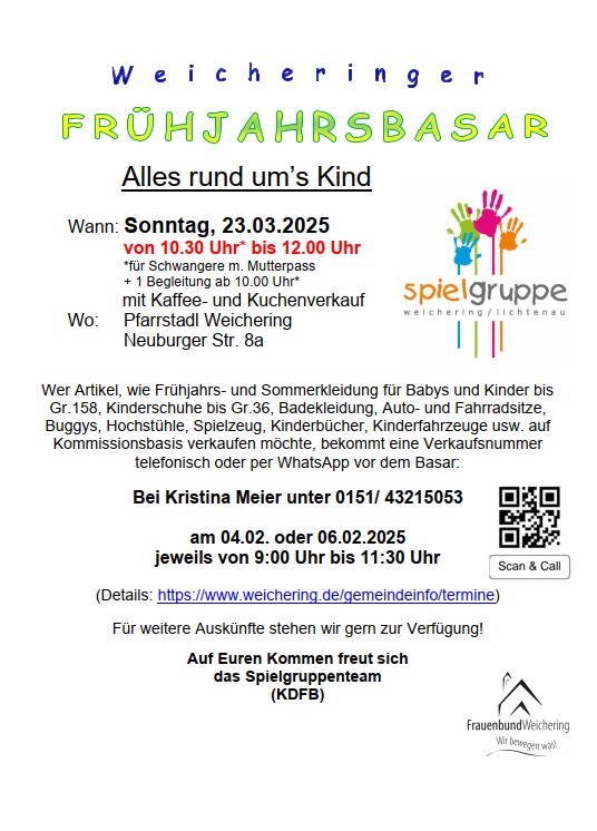 Wir organisieren 2-mal im Jahr einen Basar, in dem Artikel, wie z. B. Frühjahrs- und Sommerkleidung/ Herbst- und Winterkleidung für Babys und Kinder bis Gr. 158, Kinderschuhe bis Gr. 36, Badekleidung, Auto- und Fahrradsitze, Buggys, Hochstühle, Spielzeug, Kinderbücher, Kinderfahrzeuge zum Verkauf angeboten werden können.