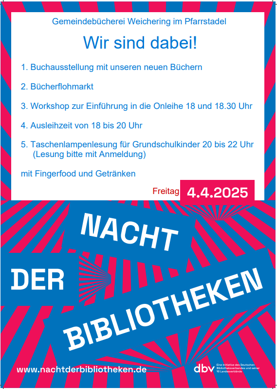 Nacht der Bibliotheken 14.03.2025 Die Gemeindebücherei Weichering nimmt am Freitag, 04.04.2025 an der Nacht der Bibliotheken teil.